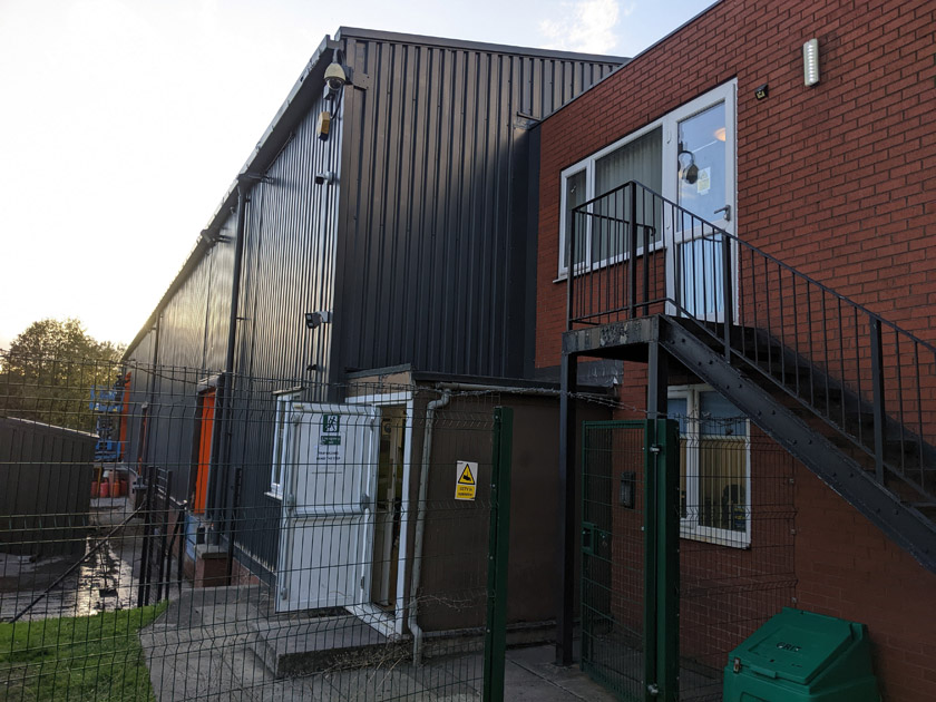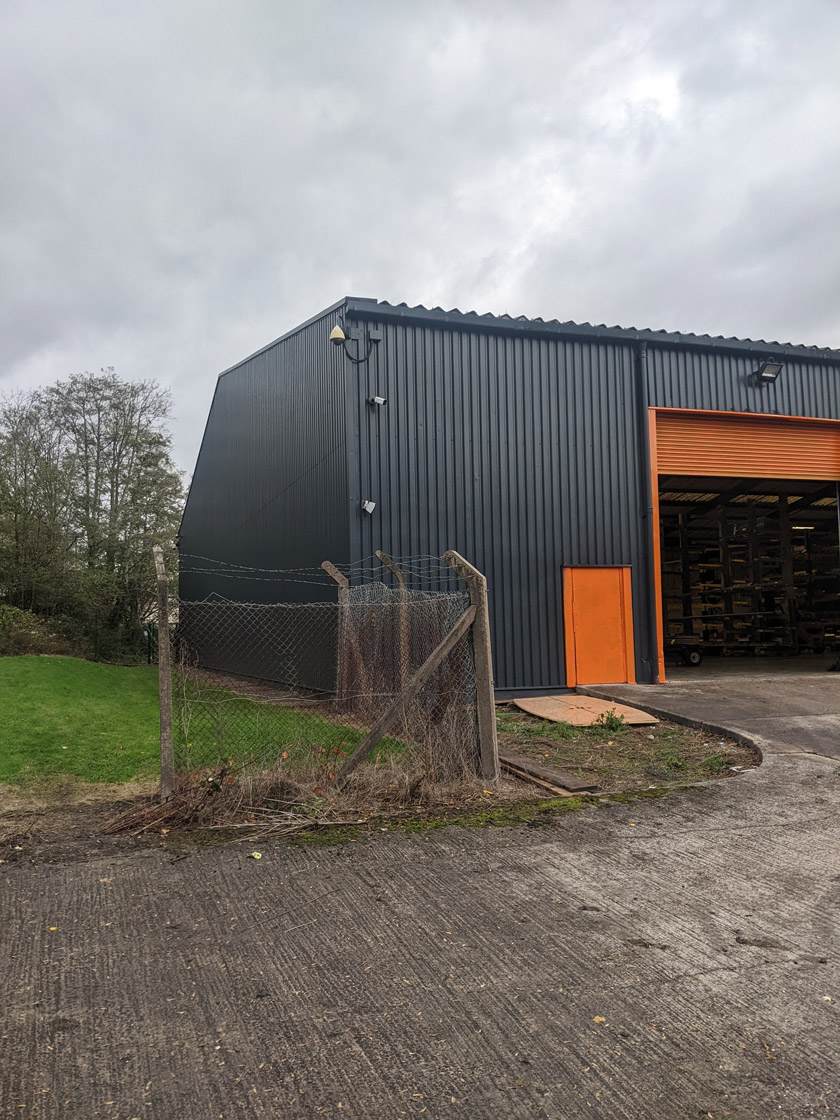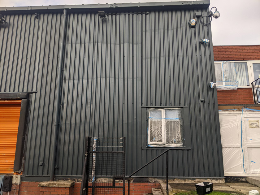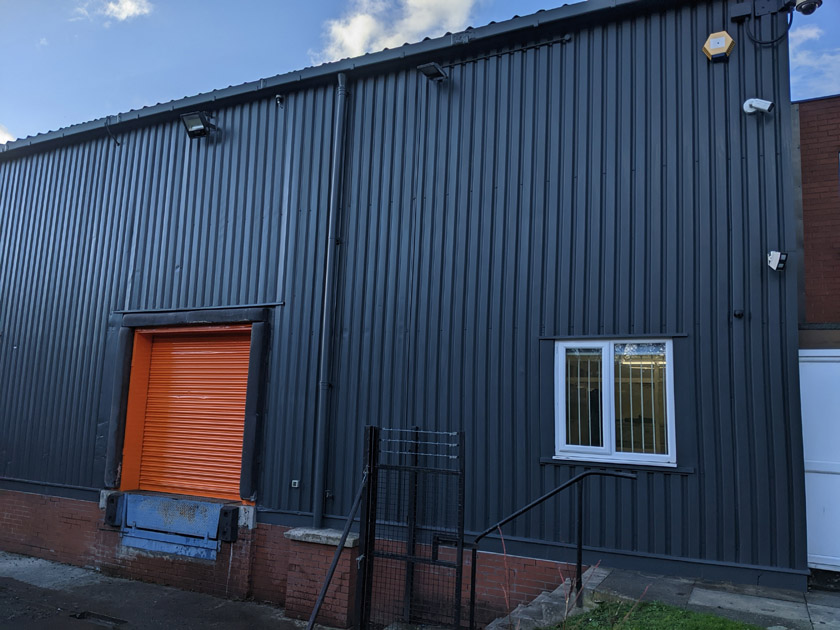 Faded and deteriorating metal cladding required re-coating on this industrial unit. We recoated the walls, replaced the gutter and refinished the roller shutter doors.