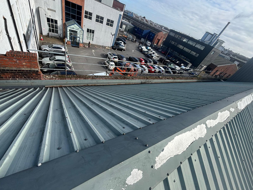 The Sheffield site required a comprehensive refurbishment programme focused on addressing water ingress risks, ageing roof components and failing gutter systems. As with many industrial and storage facilities, the building’s metal roof and guttering had experienced natural deterioration over time. Fixings had begun to fail, fillers were missing or degraded, and previous temporary repairs such as flashband, were no longer providing adequate protection.